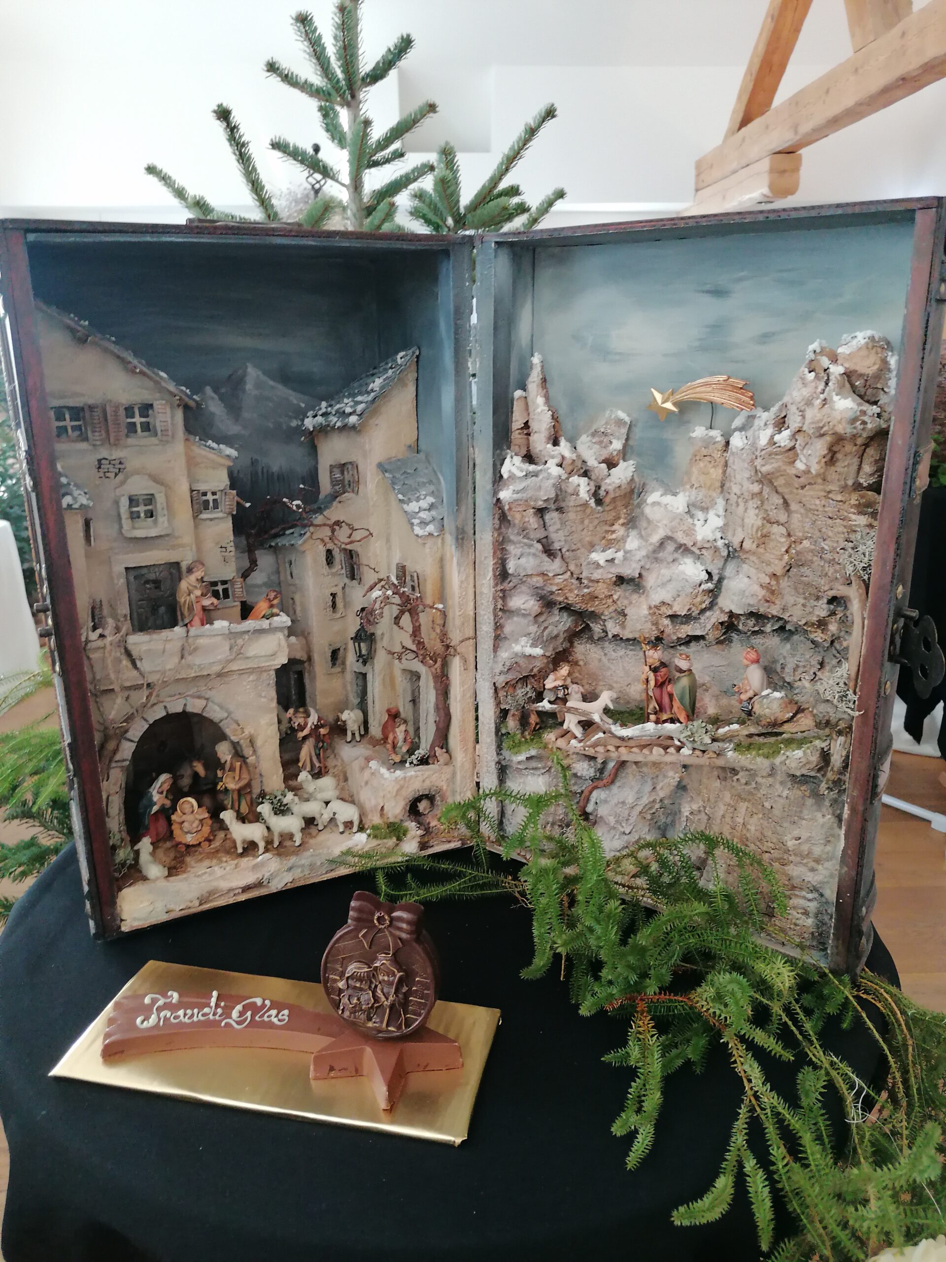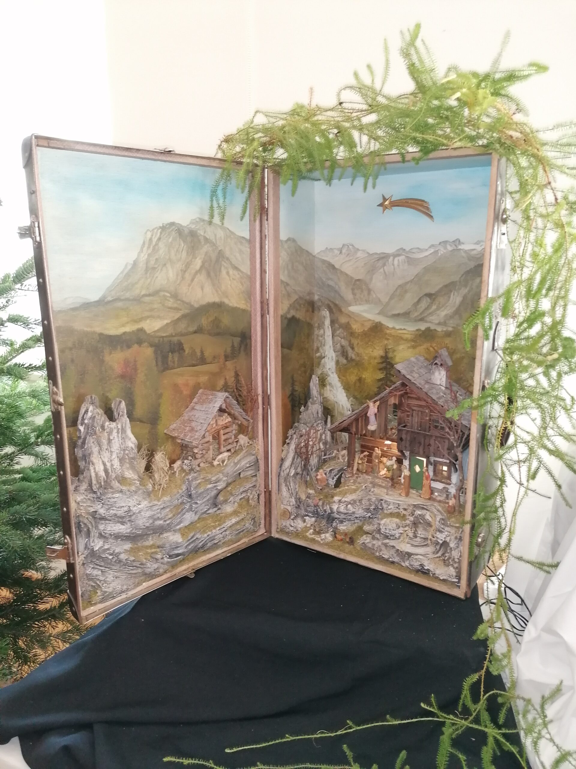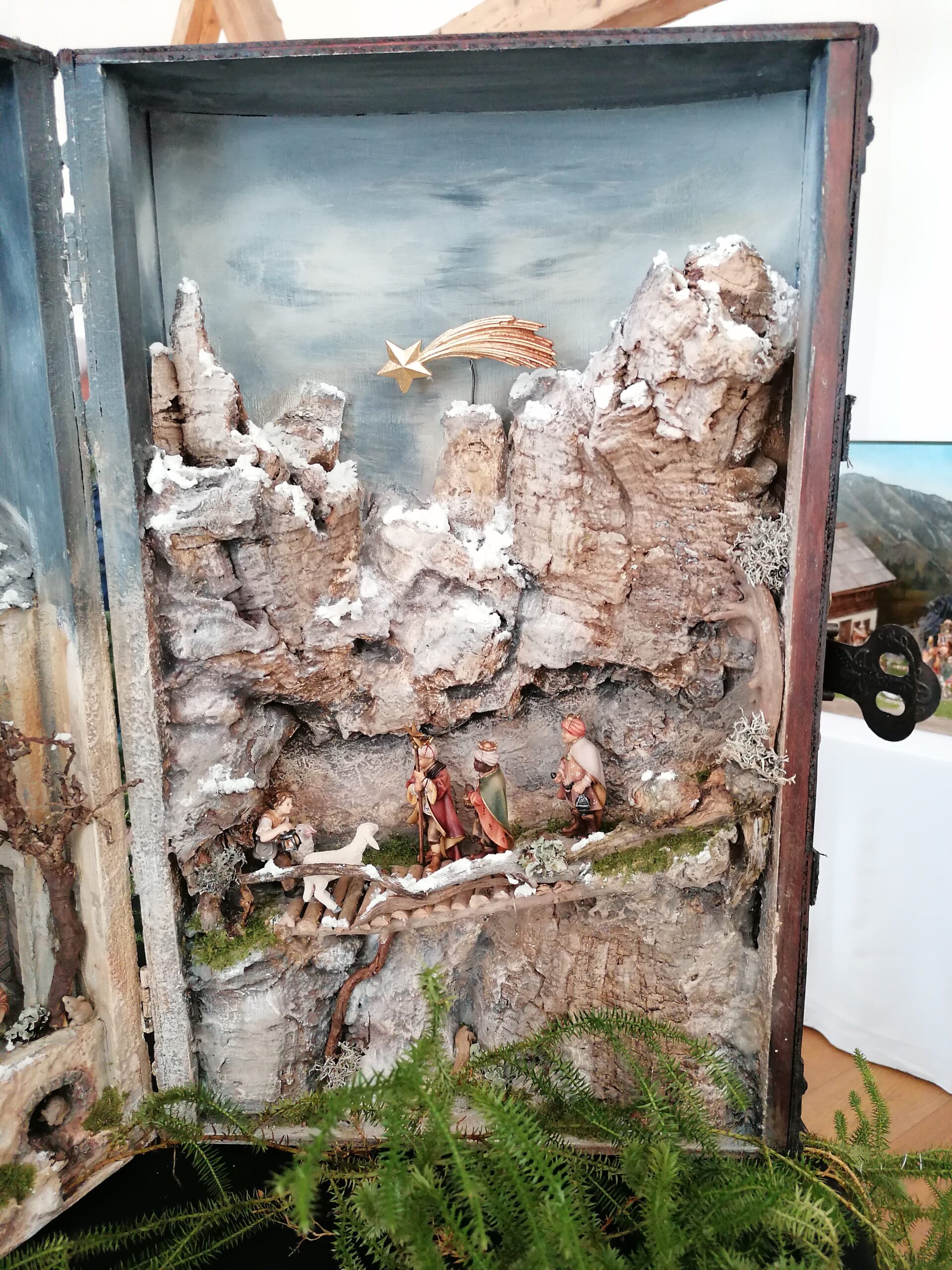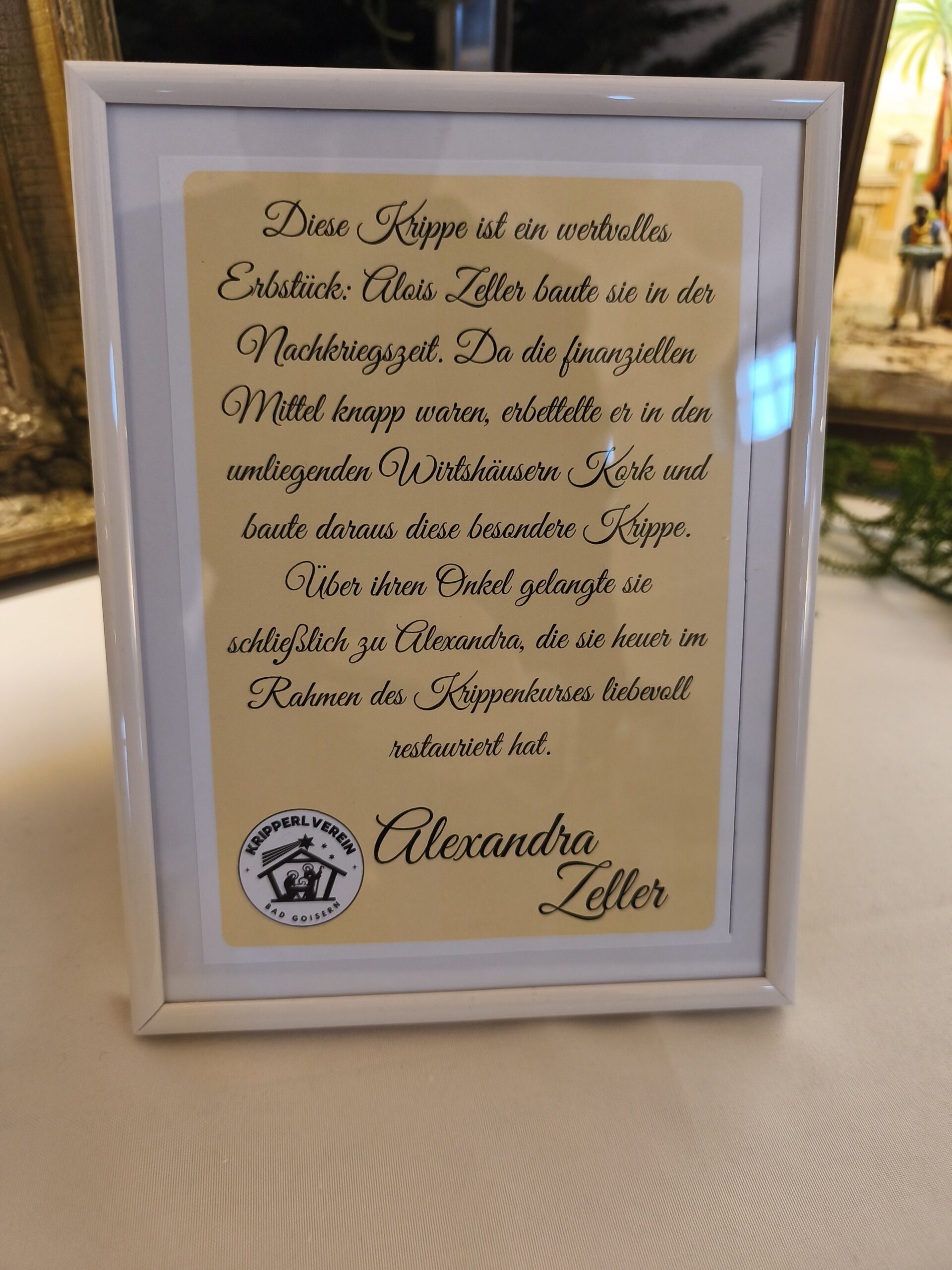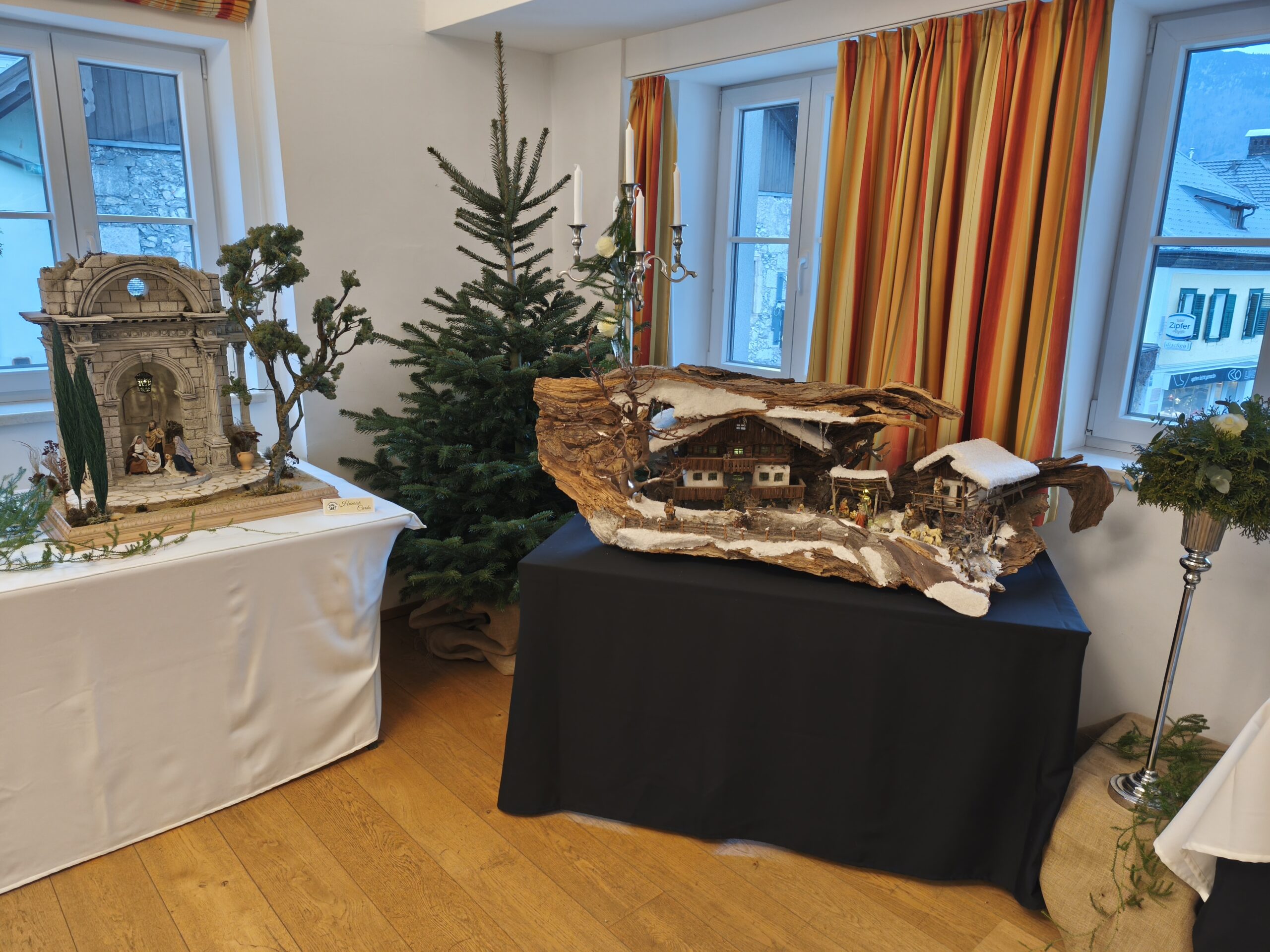 Die neu gebauten Krippen werden jährlich am 3. Adventwochenende im Katholischem Pfarramt in Bad Goisern ausgestellt. Zusätzlich zu den Kurskrippen werden Leihgaben unserer Vereinsmitglieder zu bewundern sein. Bewundert die Kripperl im wunderschönen Ambiente des Pfarrhofes und mit etwas Glück, könnt ihr die Verlosungskrippe gewinnen. Mit dem Kauf eines Loses unterstützt ihr unseren Verein. Auch die Einnahmen aus unserem „Kripperl-Cafe“ kommen unserem Verein zu Gute. Gern können Kuchen/ Torten auch nach Hause mitgenommen werden.